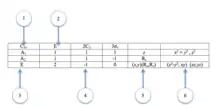 A symmetry operation is “a geometrical operation that moves an object about some symmetry element in a way that brings the object into an arrangement that is indistinguishable from the original”(Pfennig, 199)[2]. The symmetry operations are at the first row at the top of the table. They are organized into classes, with each class having an order number in front of it. For example, 2S4 represents the operation S4 with order number 2. Operations can belong to the same class when one operation may be replaced by another in a new coordinate system that is accessible by a similar symmetry operation.