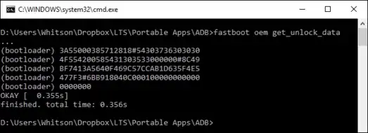 6. The Command Prompt will spit out a token in the form of a very long string of characters (see right). Select it, copy it, and paste it into the applicable box on your manufacturer’s website–make sure there are no spaces!–and submit the form. If your device is unlockable, you’ll receive an email with a key or file that you’ll use in the next step.