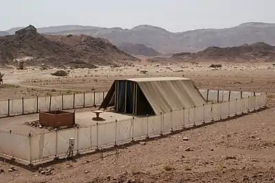 According to the Hebrew Bible, a Tabernacle was the portable dwelling place for the divine presence from the time of the Exodus from Egypt through the conquering of the land of Canaan. Built to specifications revealed by God to Moses at Mount Sinai, it accompanied the Israelites on their wanderings in the wilderness and their conquest of the Promised Land. The First Temple in Jerusalem superseded it as the dwelling-place of God.
