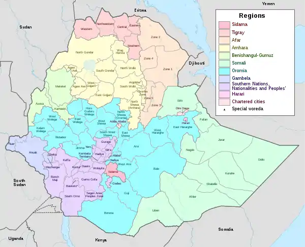 Cushitic peoples were present on the central Ethiopian plateau as early as 5000 B.C. They spread to settle most of North-East Africa before the arrival of Semitic speakers around 1000 B.C. As Cushitic groups migrated south and east, five linguistic groups were formed: Northern (e.g., Beja), Central (e.g., Agaw), lower Eastern (e.g., Oromo, Somali, Saho, Afar, Konso), highland Eastern (e.g., Kambatta, Haddiya, Walayitta), and Southern (in present-day Tanzania). Other than this, little is known about the origins of the Oromo people.[1] There is little written record of the Oromo people until they came into conflict with southern-expanding Abyssinia in the 16th Century. Oromia existed as several independent kingdoms and nations until the Abyssinian conquest of the 1880s, at which point Oromia became part of the Ethiopian Empire.[2] Many of the previous Oromo kingdoms became provinces of Ethiopia, such as Jimma, Illubabor, Wellega, Shewa, Arsi, Bale, and Hararge. These areas had developed distinct dialects of Oromo which are still present.