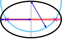 A method to locate the foci of any ellipse: the foci (purple crosses) are at intersects of the major axis (red) and a circle (cyan) of radius equal to the semi-major axis (blue), centred on an end of the minor axis (grey)