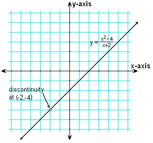y's otherwise linear form can be expressed by an equation removed of its discontinuity. Factor from the numerator (use synthetic division).
