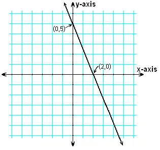 so the y-intercept point is (0,5). Drawing a line through (2,0) and (0,5) would produce the following graph.