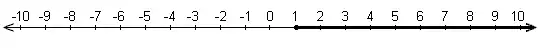 As with the third example, we can use combinations of the two types of parentheses to display any interval on the real numbers. A set of continuous numbers can also be defined which starts (or ends) at one number and extends infinitely in either the positive direction or the negative direction. Geometrically, such a set is represented by a ray on the number line, where the continuous set of numbers is shown as a bolder part of the line. If the endpoint is included in the set, the endpoint is closed and represented by a solid dot. If the endpoint is not included in the set, the endpoint is open and represented by a hollow dot. As an example, a set of numbers greater than or equal to 1, is shown on a number line below: