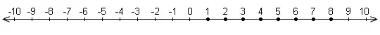 The arrowheads at the opposite ends of the drawing of the number line mean that line in concept extends infinitely in those directions, even though the drawing of the line cannot be extended forever in those directions. Note that the right side of the number line stretches to positive infinity and the left side stretches to negative infinity. Numbers in a set can be shown as dots on (or near) a number line. For example, the above set of natural numbers from 1 to 8 would be shown as follows: