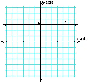 Equations of the form y = C2 are linear functions of the general form y = m x + b where slope m = 0 and the constant C2 is the y-intercept b (in the general form). The graph of this zero-slope function is a straight horizontal line, intercepting the y-axis at C2, including zero and extends infinitely in the positive and negative directions for all R values of x (see the following diagram).