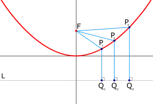 A parabola is the set of points that is the same distance away from a single point called the focus and a line called the directrix. The distance to the line is taken as the perpendicular distance.