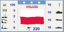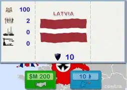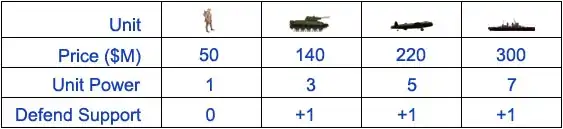 • Resource provided to player by Country. In example is $M 200, 4 Infantry, 4 Tanks, 2 Aircraft and 1 Battleship each turn.