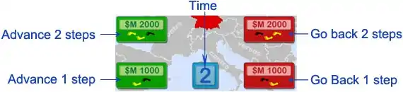 • Advance 1 step (green button with 1 yellow footprint): initially cost $M 1000, the cost will increase after each strategic move buying, i.e. second time is $M 2000, 3rd time is $M 4000 and go on.