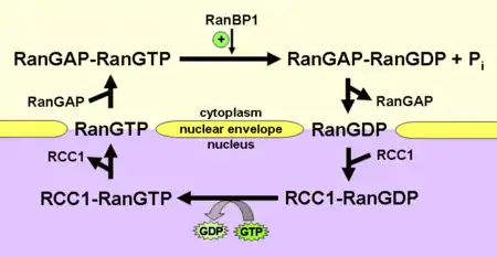 Ran (RAs-related Nuclear protein) is a small 25Kda protein that is involved in transport into and out of the cell nucleus during interphase and also involved in mitosis. It is a member of the Ras superfamily.Ran exists in the cell in two nucleotide-bound forms: GDP-bound and GTP-bound. RanGDP is converted into RanGTP through the action of RCC1(regulator of chromosome condensation 1), the nucleotide exchange factor for Ran. RCC1 is also known as RanGEF (Ran Guanine nucleotide Exchange Factor). Ran's intrinsic GTPase-activity is activated through interaction with Ran GTPase activating protein (RanGAP), facilitated by complex formation with Ran-binding protein (RanBP). GTPase-activation leads to the conversion of RanGTP to RanGDP, thus closing the Ran cycle.