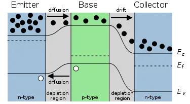 The EBJ potential barrier lowers, and some electrons can drift across into the base, whereupon they are swept up by the electric field from the collector, and "fall" down the potential hill into the collector. A few holes also diffuse from base to emitter.