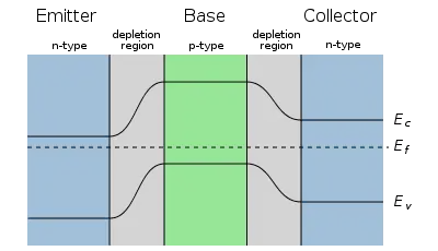 We can consider the action of an NPN BJT using band diagrams. With no applied voltages, we see the following shape: