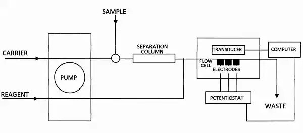 Instrumentation for electrochemiluminescence differs from that for other chemiluminescence only in having a flow cell provided with working, counter and reference electrodes, regulated by a potentiostat, which is in turn controlled by the computer that receives input from the photomultiplier or other transducer that receives the light signals. Figure D7.1 shows the usual flow injection manifold used for measuring electrochemiluminescence. The flow cell is in a light-tight box to exclude ambient light. A more portable alternative is a probe containing a set of electrodes and a fibre optic bundle to carry emitted light to a photomultiplier. Ambient light is excluded by means of baffles in the channels that admit the test solution. Because it can be electrochemically regenerated, it is useful to immobilize [Ru(bipy)3]3+ in a cation exchange resin deposited on the electrode to form a sensor that does not need a continual reagent supply.