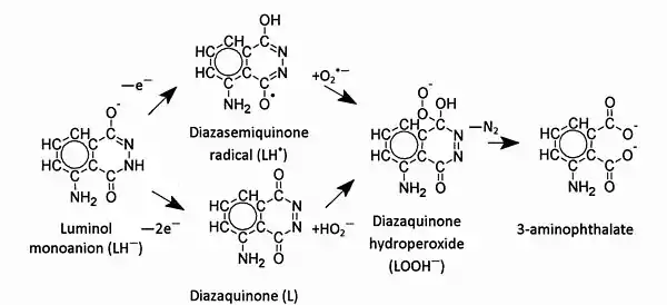 - ↑ Merényi G, Lind J and Eriksen T E, Luminol Chemiluminescence: chemistry, Excitation, Emitter, J. Biolumin. Chemilumin., 1990, 5, 53.