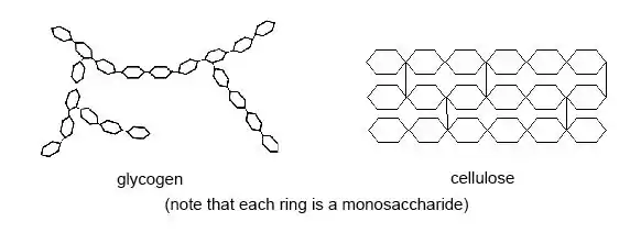 Polysaccharides like starch, glycogen and cellulose are formed by tens or hundreds of monosaccharides linking together. Unlike mono- and di-saccharides, polysaccharides are not sweet to taste and most do not dissolve in water.