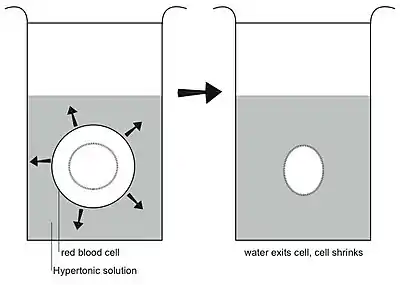 Now think what would happen if red blood cells were placed in a salt solution that has a higher salt concentration than the solution within the cells (see diagram 3.8). Such a bathing solution is called a hypertonic solution. In this situation the “concentration” of water within the cells would be higher than that outside the cells. Osmosis (diffusion of water) would then occur from the inside of the cells to the outside solution, causing the cells to shrink.