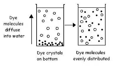 Diagram 3.5 shows what happens when a few crystals of a dark purple dye called potassium permanganate are dropped into a beaker of water. The dye molecules diffuse into the water moving from high to low concentrations so they become evenly distributed throughout the beaker.