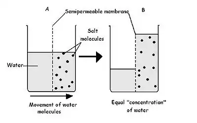 Take a look at side A of diagram 3.6. It shows a container divided into two parts by an artificial semi-permeable membrane. Water is poured into one part while a solution containing salt is poured into the other part. Water can cross the membrane but the salt cannot. The water crosses the semi-permeable membrane by diffusion until there is an equal amount of water on both sides of the membrane. The effect of this would be to make the salt solution more diluted and cause the level of the liquid in the right-hand side of the container to rise so it looked like side B of diagram 3.6. This movement of water across the semi-permeable membrane is called osmosis. It is a completely natural process that requires no outside energy.