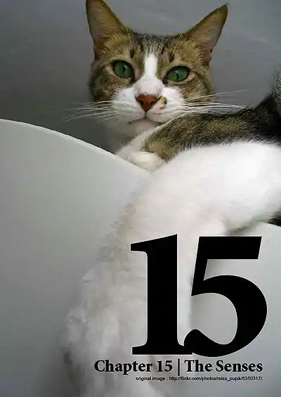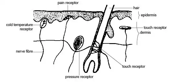 Within the dermis of the skin are numerous modified nerve endings that are sensitive to touch and pressure. The roots of hairs may also be well supplied with sensory receptors that inform the animal contact with an object (see diagram 15.1). Whiskers are specially modified hairs.