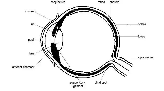 - optic nerve | choroid | cornea | aqueous humor | retina | cones | iris | vitreous humour | sclera | lens