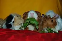 Guinea Pigs (also called cavies after their scientific name) are rodents belonging to the family Caviidae and the genus Cavia. Despite their common name, the animals are not pigs, nor do they come from Guinea. Male guinea pigs are called boars, females sows and babies are called pups. They are originally native to the Andes, and while they are no longer extant in the wild, they are closely related to several species which are commonly found in the grassy plains and plateaus of this region. The guinea pig plays an important role in the folk culture of indigenous South Americans, especially as a food source, but also in folk medicine and in community religious ceremonies. Since the 1960s, the guinea pig has become increasingly important as a staple food in the Andes, and efforts have been made to increase consumption of the animal outside South America. See the cookbook entry for links to recipes.