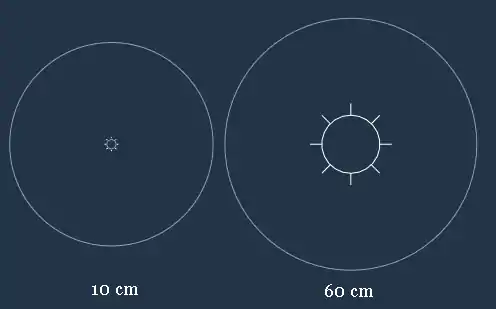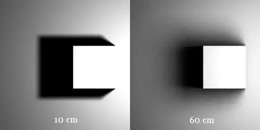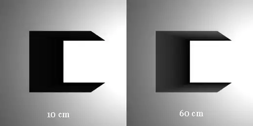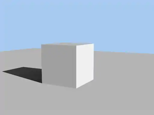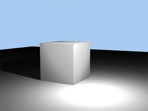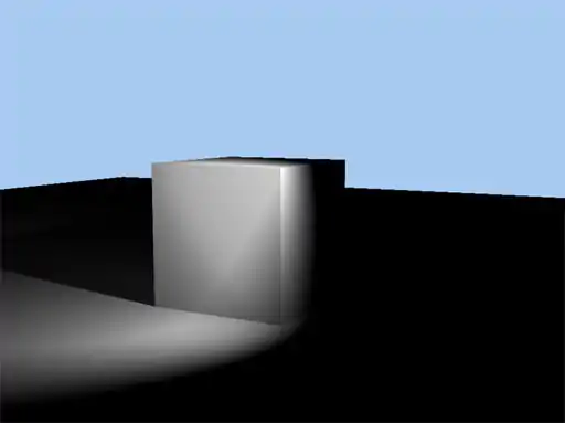 This is a Top view of a Box that is positioned just below and to the left of the light source. Notice that the shadow on the 60 cm Width Light appears to have a gradient on it unlike the nearly solid black shadow of the 10 cm Width Light. To get rid of the gradients, turn up the ray casts, and turn on multipass.
