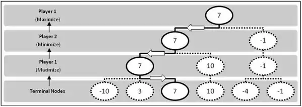 The first step is to give each node a value in terms of utility for player 1. These values are derived from the values of the terminal nodes, which each represent an end of the game. Each level of the tree alternates between player 1’s move, who is trying to maximize her score, and player 2’s move, who is trying to minimize player 1's score in order to undermine her success. If the level above the terminal nodes represents player 2’s possible moves, then the value of the nodes will be the lowest value among those of their children, the minimum. On the other hand, if this level represents the possible moves for player 1, the value of its nodes will be the highest value among those of their children. Finally, once all the nodes have been assigned values, it is decision time for player 1 who just picks the move which will lead to the highest value (Russell & Norvig, 1995). Figure 1 illustrates this process.