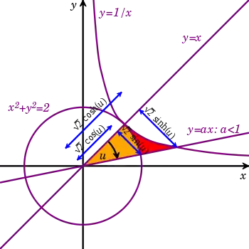 Angle size and sector area are the same when the conic radius is √2. This diagram illustrates the circular and hyperbolic functions based on sector areas u.