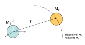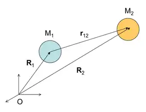 where is the relative position vector of mass 1 with respect to mass 2, expressed as: