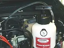 • Pressure Method: A specialized pressure pump, is attached to the master cylinder and filled with fluid. The pump is used to pressurize the system to about 10psi, and the bleeder valves are opened one at a time until the fluid is clear of air. One advantage to this system is that the pump reservoir usually holds enough fluid that running dry is not likely. This is the method most professional shops use.