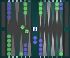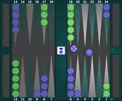 A few turns from the beginning of a sample game will illustrate the rules of movement. To start the game, blue rolls a 4 and green rolls a 1, so blue takes the first turn playing a 4-1. This is an unfavorable opening roll, arguably the worst possible, but blue uses it the best he can. He takes a checker from each of his heavy points by playing 13/9 6/5 (from the 13-point to the 9-point, and from the 6-point to the 5-point).
