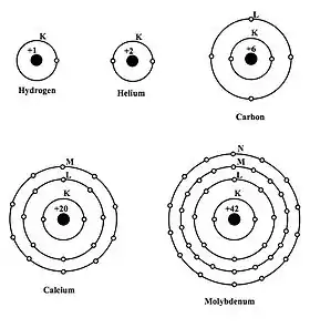 There's a couple of additional points to note about the above figure. Firstly, note that the electrons occupy defined orbits around the nucleus in this simplified view. These orbits are sometimes called shells and are labelled K, for the innermost one, L, M, N etc.