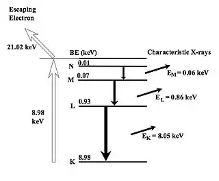 The X-rays produced by these transitions are called Characteristic Radiation because they are characteristic of the element which produces them. Thus, for example, the principal transitions in copper, whose energy level diagram is shown in Figure 1.8, are 8.97 keV (N-shell to K-shell), 8.91 keV (M-shell to K-shell) and 8.05 keV (L-shell to K-shell).