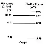 The figure shows the K-shell at the bottom with an occupancy of 2 electrons and with the greatest binding energy. Above it is the L-shell with an occupancy of 8 electrons and a lower binding energy - and so on for the other shells.