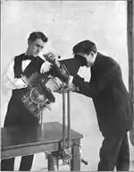 X-rays were first detected by Röntgen himself using the fluorescence generated within barium platinocyanide crystals. These fluorescent crystals produce scintillations (i.e. minute flashes of light) when they absorb X-rays. Numerous other materials were also found to scintillate, e.g. calcium tungstate, gadolinium oxysulfide, cesium iodide and sodium iodide to name just four which have been widely used in Diagnostic Radiography. Figure 1.11 illustrates the use of an intensifying screen in the early 20th century.