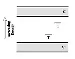 The ‘Increasing Energy’ arrow in the figure refers to the energy of the electrons. The outer-shell electrons of the crystal’s atoms are considered to occupy the valence band (V). When they leave the atom they are considered to join the conduction band (C). An energy gap exists between these two bands which normally cannot be occupied by electrons. However, impurities and lattice defects in the crystal may generate intermediate energy levels (T) which can trap electrons within the energy gap. These traps may result from the manufacturing process, for instance, or they may be designed into the crystal structure.