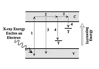 Another alternative is that the electron dropping from the conduction band gets trapped in an intermediate energy level (Process #4). The electron stays in this trap until something happens to release it - an event which is accompanied by the emission of light in some crystals. This ‘something’ can generally be provided by another form of energy, such as heat - as in thermoluminescence - or light - as in photo-stimulable luminescence. The thermoluminescent process is exploited in the thermoluminescent dosimeter (TLD) which is widely used in personal radiation monitoring. Photo-stimulable luminescence (PSL) is exploited for X-ray imaging purposes in Computed Radiography (CR).