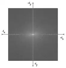 FFTs can also be calculated in two-dimensions to give results such as those in Figure 1.27. Since Fourier analysis generates results in terms of both positive and negative spatial frequencies, these can be plotted in the form of a 2D image so that the maximum frequency lies at the origin and those for the horizontal and vertical directions are shown increasing towards that origin. The modulation at different spatial frequencies is represented using a grey-scale. Low frequency bands can be seen along the horizontal axis in the figure, for example, representing the horizontal periodicity of image data from the fingers, while finer bands along the y-dimension are indicative of a periodicity of image data from the various metacarpophalangeal joints. Higher frequency features can also be seen running diagonally in this 2D-FFT, representative of the trabecular structure of the bones, for example.