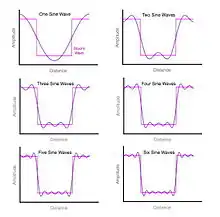 A fundamental feature of Fourier methods is that they can be used to demonstrate that any waveform can be approximated by the sum of a large number of sine waves of different frequencies and amplitudes. The converse is also true, i.e. that a composite waveform can be broken into an infinite number of constituent sine waves. This is demonstrated in Figure 1.25, where the process of adding sine waves can be seen generate reasonable approximations to a square wave. The mathematical process for identifying constituent sine waves in a composite waveform is called the Fourier Transform. It is generally calculated using a computer algorithm called the Fast Fourier Transform (FFT). The reverse process of summing such sine waves to generate a composite waveform is called the Inverse Fourier Transform - see Figure 1.26.