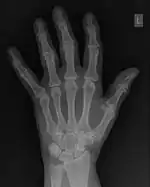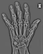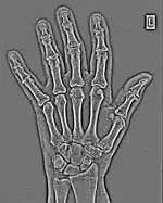 ![]() Fig. 1.28(a): A radiograph of the wrist. | ![]() Fig. 1.28(b): The wrist radiograph processed by attenuating periodic structures of size between 1 and 10 pixels. |