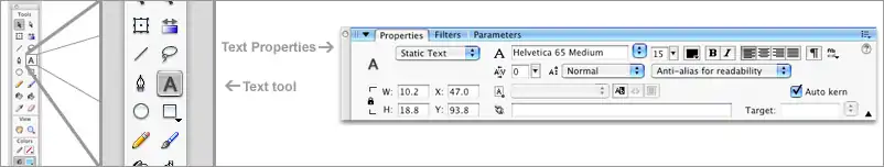 At first glance, type may seem an easily overlooked feature in Flash. However, the text features in Flash are very comprehensive and allow the user to explore their typographic creativity. Flash uses vectors to create type. Vectors are mathematical algorithms used in programs such as Adobe Flash and Adobe Illustrator to create shapes that are both scalable and small in file size. In contrast, bitmap or raster images are created pixel by pixel yielding subtle color detail such as in photographs. Vector type is a great choice for Flash because it allows for precise lines and scalability without inflating file size.