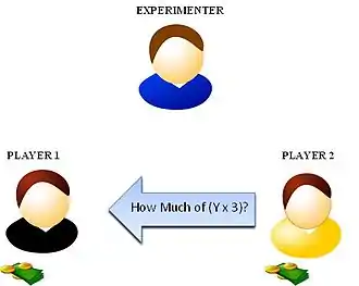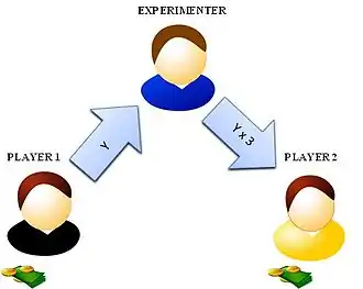 In the trust game, like the ultimatum game and the dictator game, there are two participants that are anonymously paired.[5] Both of these individuals are given some quantity of money. The first individual, or player, is told that he must send some amount of his money to an anonymous second player, though the amount sent may be zero. The first player is also informed that whatever he sends will be tripled by the experimenter.[6] So, when the first player chooses a value, the experimenter will take it, triple it, and give that money to the second player. The second player is then told to make a similar choice – give some amount of the now-tripled money back to the first player, even if that amount is zero.[7][8]