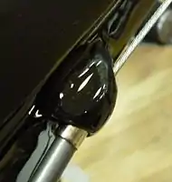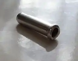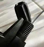 ![]() A typical plastic barrel-adjuster. The housing normally would abut within the adjuster-cap while the cable continues onward. | ![]() This type of cable cap is crimped onto cable ends, like the ones on the brake and derailleur. |