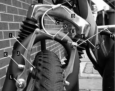 I. Brake Arm J. Brake Block (Pad). K. Block Setting Screw. L. Arm Mounting Bolt.