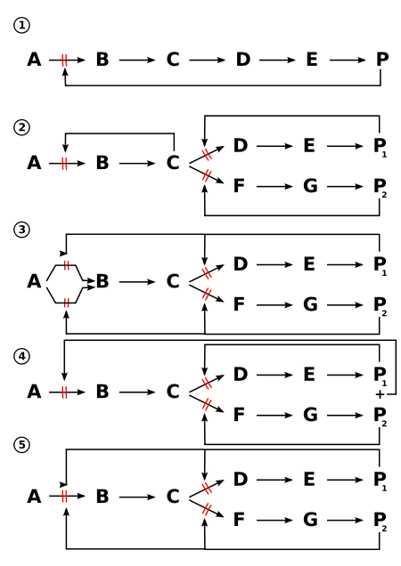 - Sequential feedback inhibition. The end products P1 and P2 inhibit the first committed step of their individual pathway (C⇀D or C⇀F). If both products are present in abundance, all pathways from C are blocked. This leads to a buildup of C, which in turn inhibits the first common committed step A⇀B.