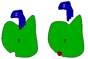 Non-competitive inhibitors/activators (I) do not bind to the active center, but to other parts of the enzyme (E) that can be far away from the substrate (S) binding site. By changing the conformation (the three-dimensional structure) of the enzyme (E), they disable or enable the ability of the enzyme (E) to bind its substrate (S) and catalyze the desired reaction. The noncompetitive inhibitor will lower Vmax but leave Km unchanged.