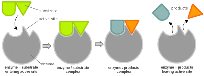 Chemical reactions need a certain amount of activation energy to take place. Enzymes can increase the reaction speed by favoring or enabling a different reaction path with a lower activation energy (Fig. 1), making it easier for the reaction to occur. Enzymes are large globular proteins that catalyze (accelerate) chemical reactions. They are essential for the function of cells. Enzymes are very specific as to the reactions they catalyze and the chemicals (substrates) that are involved in the reactions. Substrates fit their enzymes like a key fits its lock (Fig. 2). Many enzymes are composed of several proteins that act together as a unit. Most parts of an enzyme have regulatory or structural purposes. The catalyzed reaction takes place in only a small part of the enzyme called the active site, which is made up of approximately 2 - 20 amino acids.