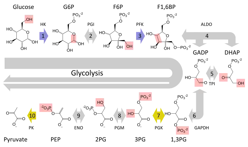 Glycolysis is a central pathway for the catabolism of carbohydrates in which the six-carbon sugars are split to three-carbon compounds with subsequent release of energy used to transform ADP to ATP. Glycolysis can proceed under anaerobic (without oxygen) and aerobic conditions.