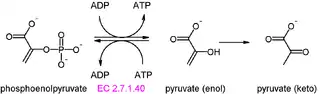 ATP is produced. Pyruvate tautomerizes rapidly and nonenzymatically to its keto form from its enol form. It is the last and one of the irreversible steps of glycolysis.
