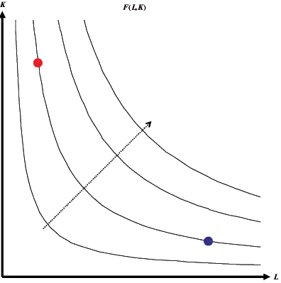 Figure 3.1 Isocurves of fishing effort production. The curves show at which rate L (Labour) can be substituted by K (Capital) and the other way around, each curve representing a constant output of F. The blue point is representing a certain production of fishing effort involving a high degree of labour inputs, while much of the labour in the red point is substituted by capital, e.g. small boats and hand line (blue point) vs. a few trawlers (red point). The dotted arrow indicates increase in effort production. |